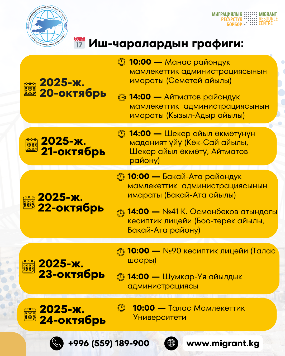 Кыргыз Республикасынын Эмгек, социалдык камсыздоо жана миграция министрлигине караштуу Жарандарды чет өлкөдө ишке орноштуруу борбору (Борбор) Эл аралык миграциялык саясатты өнүктүрүү борборунун (ICMPD) колдоосу менен Талас облусунда «Коопсуз миграция кербенинин» алкагында бир катар иш-чаралар өткөрүлөрүн маалымдайт.