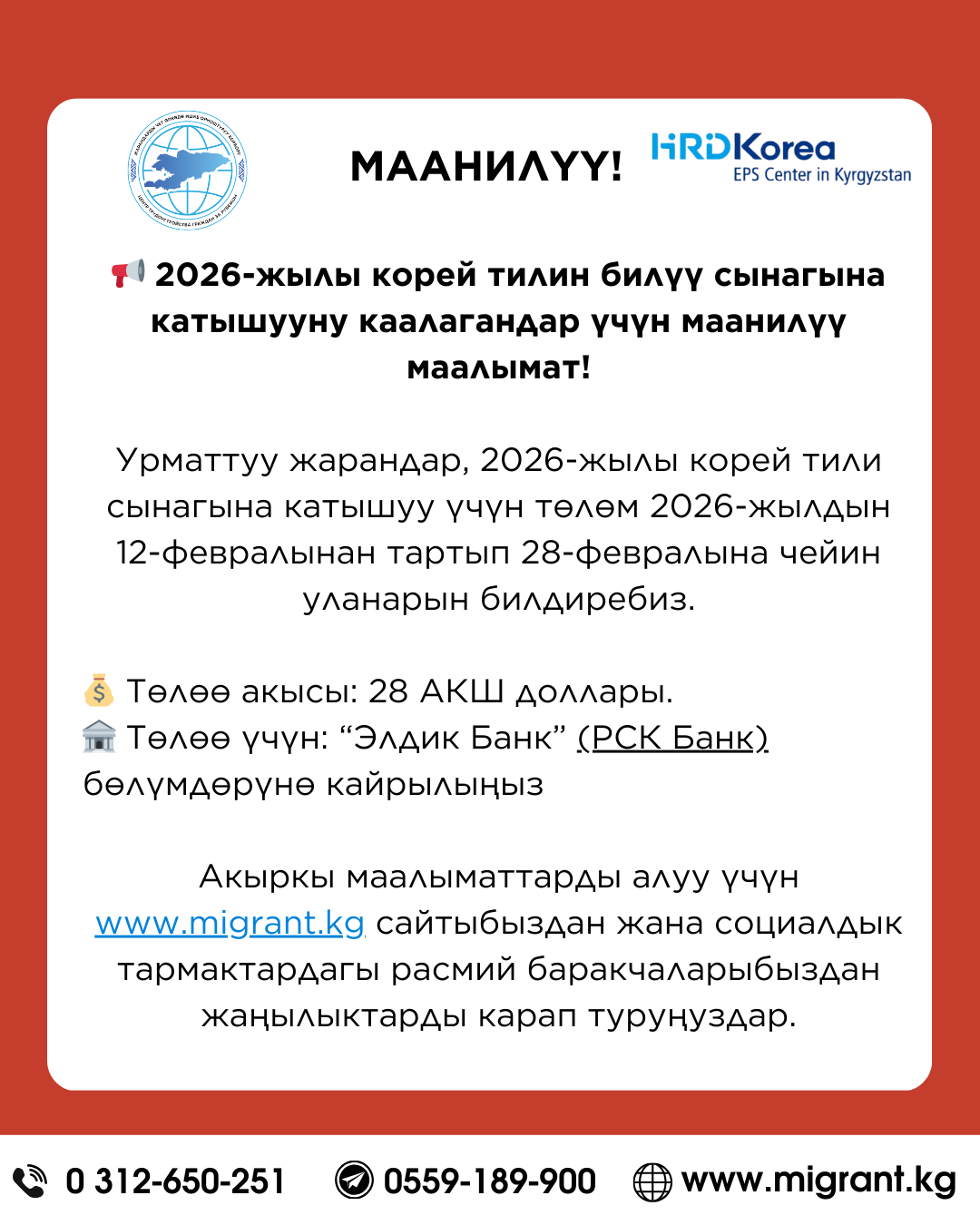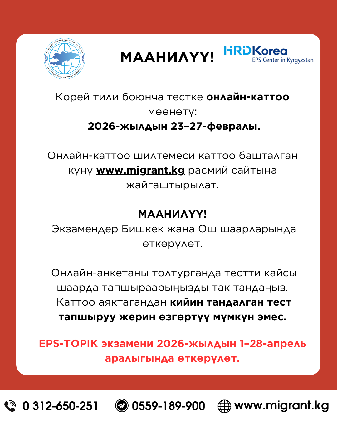 Урматтуу жарандар, 2026-жылы өндүрүш тармагына EPS-TOPIK программасы (корей тили боюнча тест) боюнча катышууну каалагандар үчүн тестке катышуу акысы 12-февралдан 28-февралга чейин кабыл алынат.