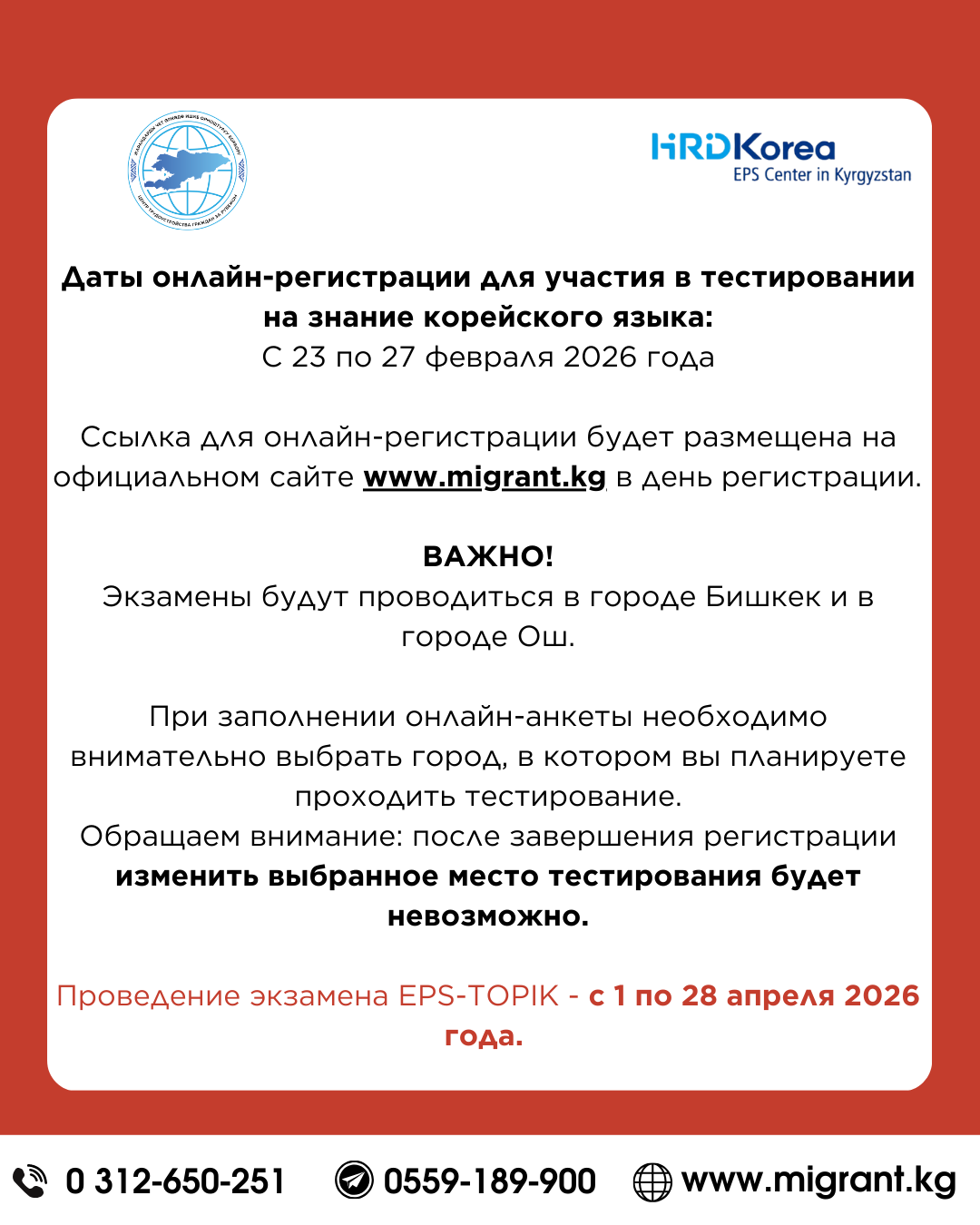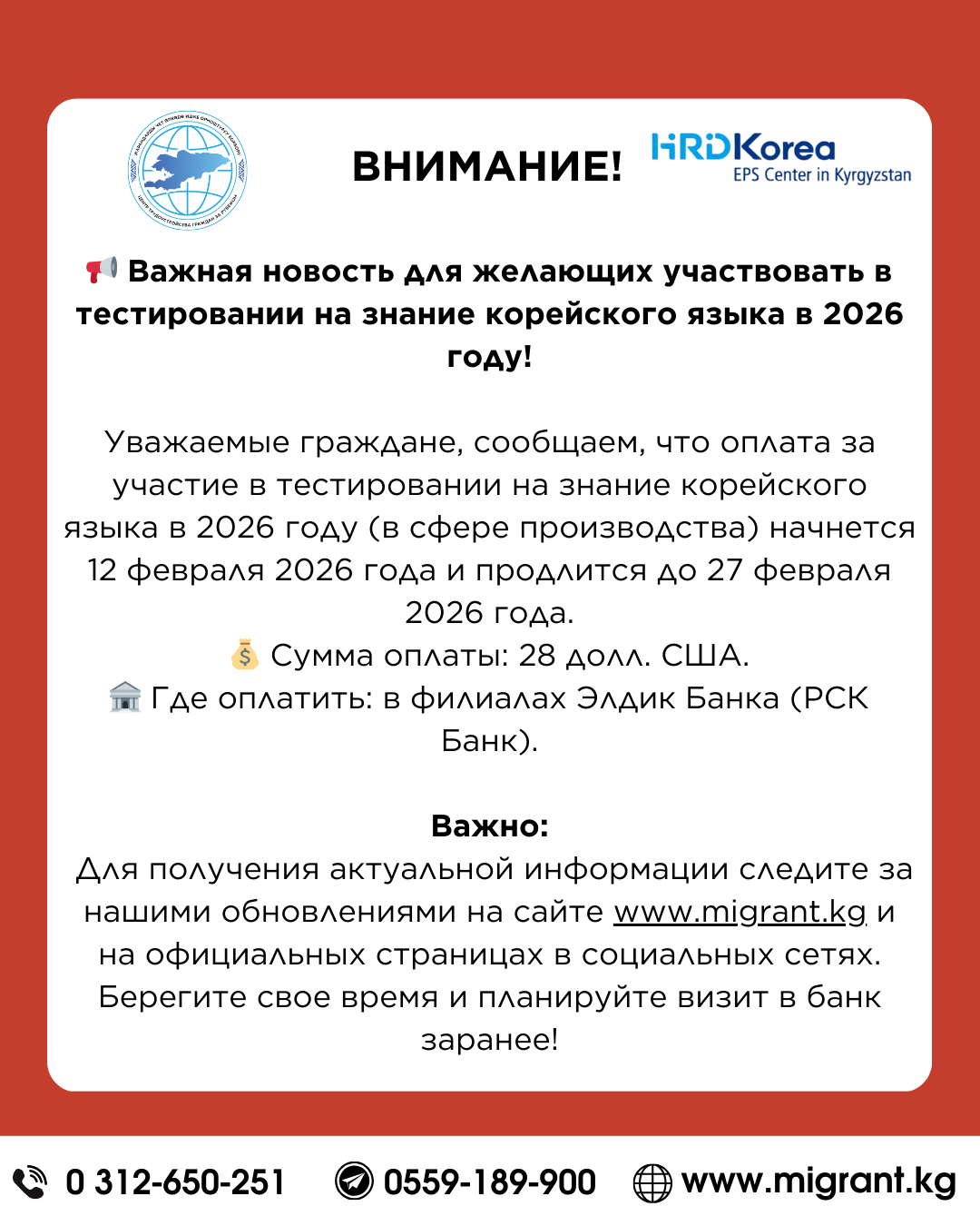 Уважаемые граждане, сообщаем, что для желающих принять участие в программе EPS-TOPIK (тестирование на знание корейского языка) в 2026 году в сфере производства, оплата за участие будет приниматься с 12 февраля по 27 февраля 2026 года.