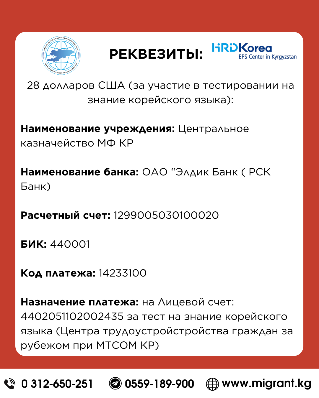Назначение платежа: на Лицевой счет: 4402051102002435 за тест на знание корейского языка (для Центра трудоустройства граждан за рубежом при МТСОМ КР)