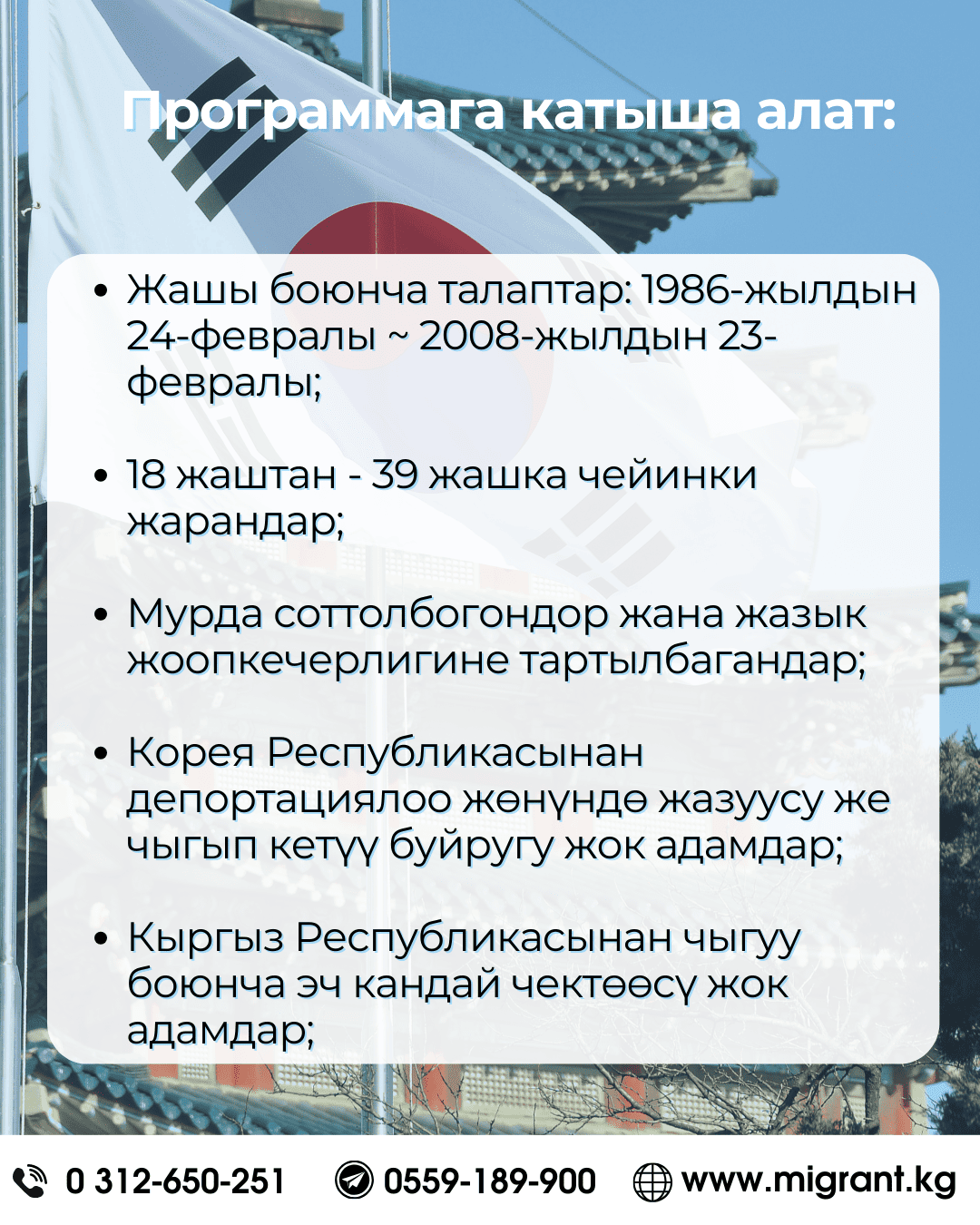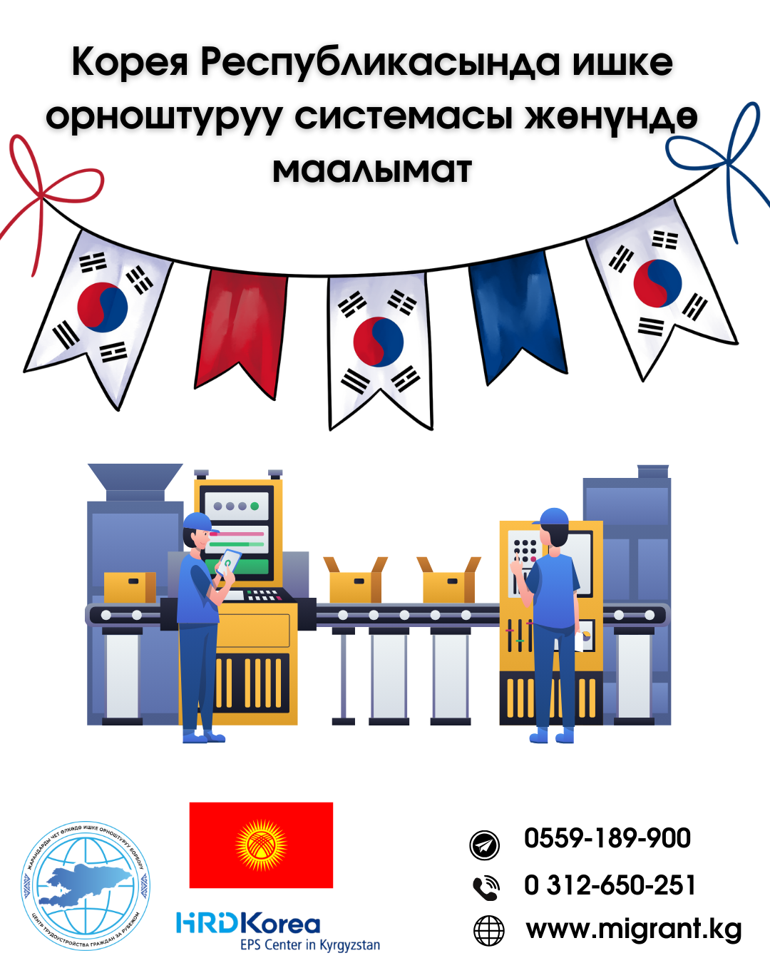 Борбор 2026-жылдын 23–27-февраль аралыгында Корея Республикасында өндүрүш тармагында ишке орношуу үчүн EPS-TOPIK программасы боюнча ЖАЛПЫ тестирлөөгө онлайн каттоо ачыларын маалымдайт