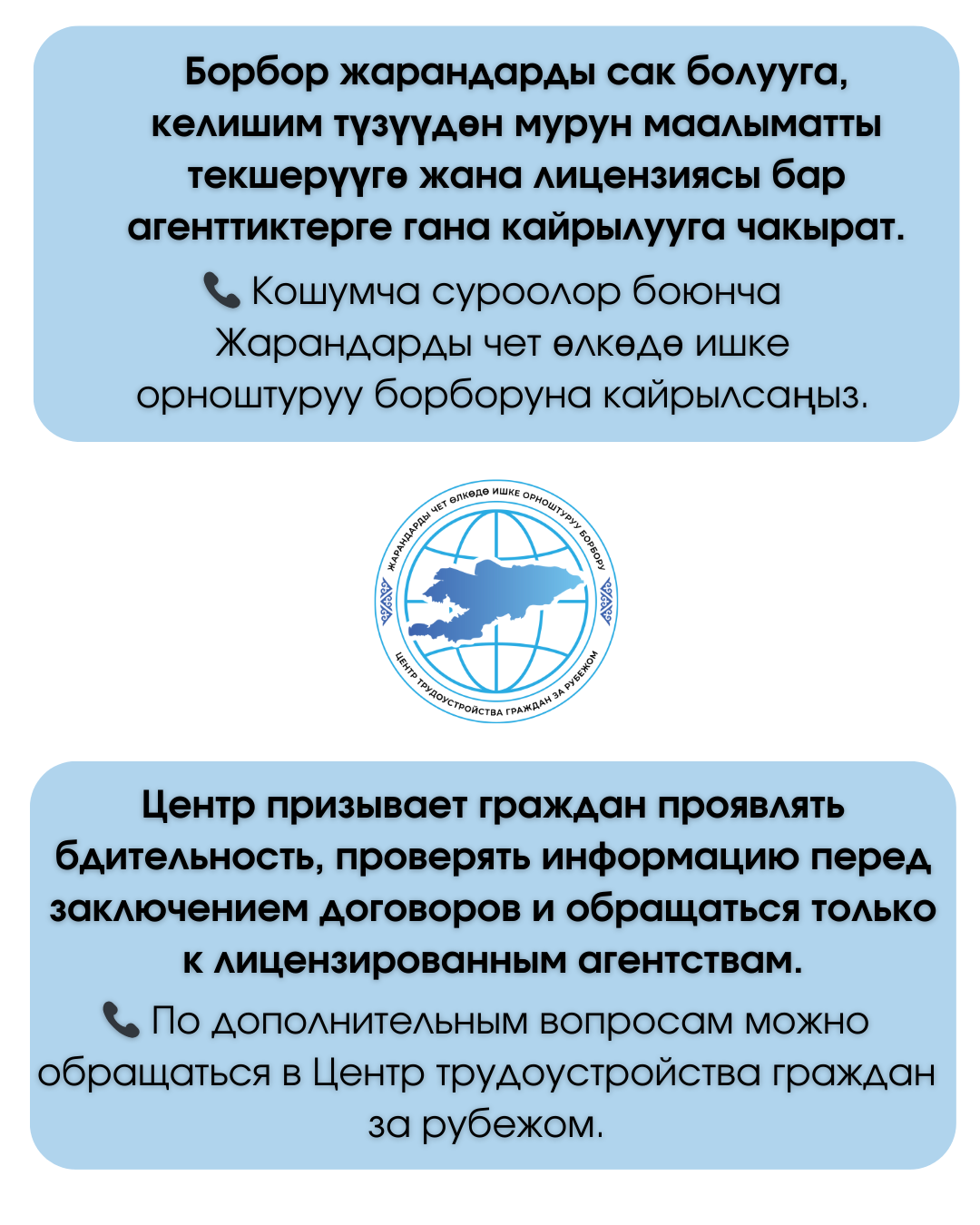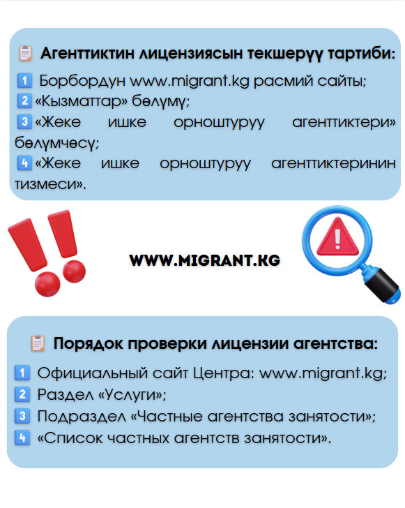 - Чет өлкөгө иштегени кетерде жеке ишке орноштуруу агенттиктеринин уруксатын (лицензиясын) текшерип алыңыз /