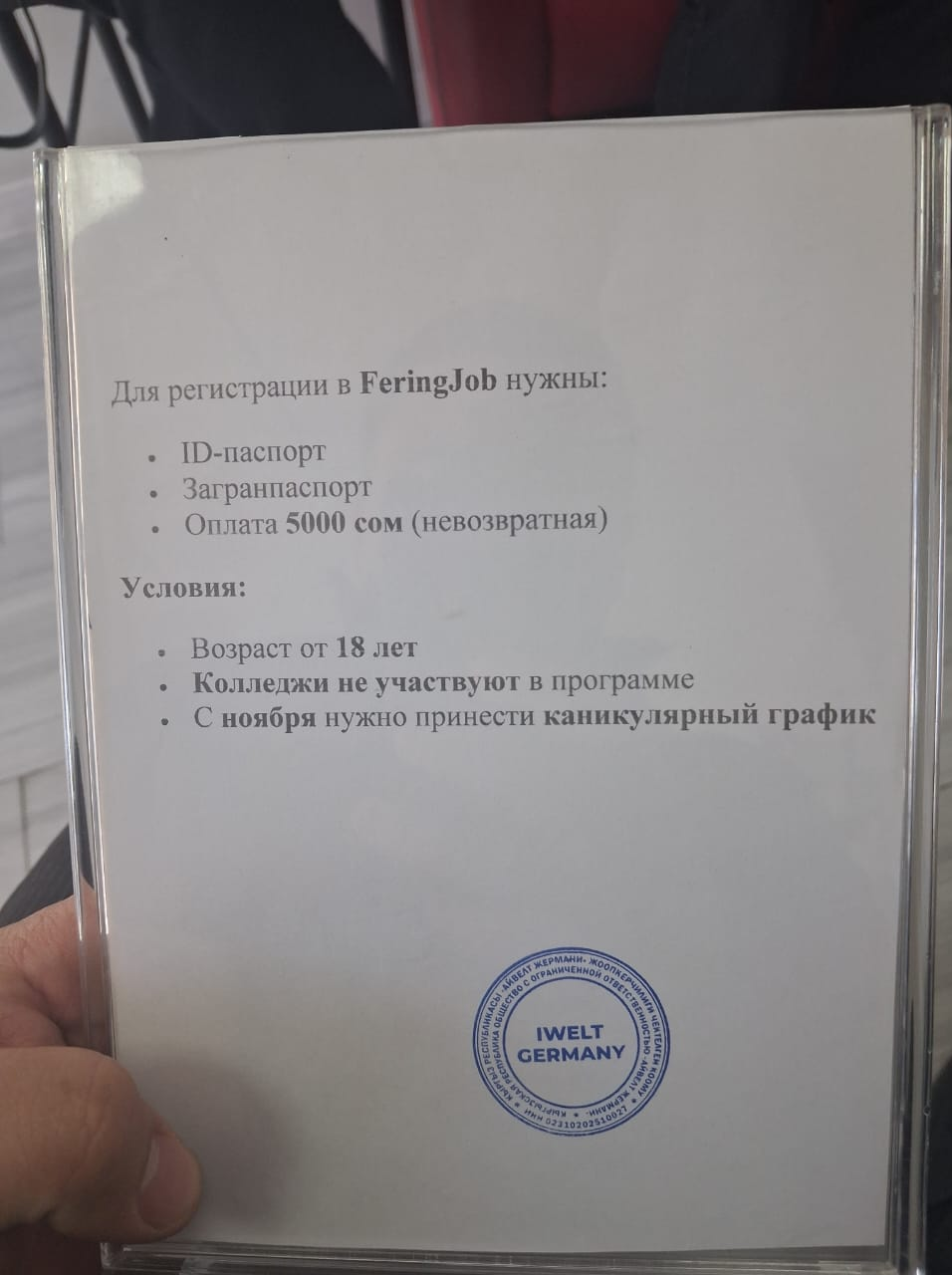 Борборго келип түшкөн маалыматка ылайык, Ош шаарындагы «Жамбы» бизнес-борборунда студенттерди жайкы сезондо Германия Федеративдик Республикасында ишке орноштуруу максатында уюшкан түрдө иш-чарасы өткөрүлүп жаткан. Иш-чараны «Iwelt.germany» деп аталган коом уюштургандыгы аныкталып, белгилей кетсек анын Кыргыз Республикасынын жарандарын Германияга Федератиадик Республикасына ишке орноштуруу боюнча иш жүргүзүүгө расмий уруксаты жок болуп чыккан.